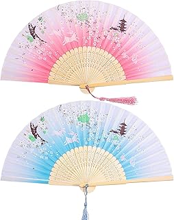 2 Stücke Folding Fans Hand Fans Bambus Fans mit Quaste Frauen Ausgehöhlten Bambus Hand Halten Fans für Wanddekoration, Geschenke (Rosa Pfirsichblüte und Blau Cherry Patter)