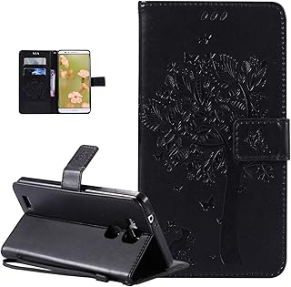 Kompatibel mit Huawei Ascend Mate 7 Hülle,Prägung Katze Schmetterlings Floral Blumen Muster PU Lederhülle Flip Hülle Handyhülle Ständer Tasche Wallet Case Schutzhülle für Huawei Ascend Mate 7,Schwarz
