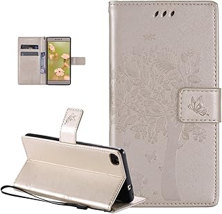 Kompatibel mit Huawei P8 Hülle,Huawei P8 Schutzhülle,Prägung Katze Schmetterlings Floral Blumen Muster PU Lederhülle Flip Hülle Handyhülle Ständer Tasche Wallet Case Schutzhülle für Huawei P8,Gold
