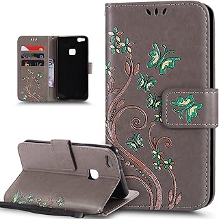 Kompatibel mit Huawei P10 Lite Hülle,Huawei P10 Lite Schutzhülle,Bunte Gemalt Prägung Schmetterlings Blumen PU Lederhülle Flip Hülle Ständer Wallet Tasche Case Schutzhülle für Huawei P10 Lite,Grau