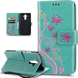 Kompatibel mit Huawei Mate 9 Hülle,Huawei Mate 9 Schutzhülle,Bunte Gemalt Prägung Schmetterlings Blumen PU Lederhülle Flip Hülle Cover Ständer Wallet Tasche Case Schutzhülle für Huawei Mate 9,Grün